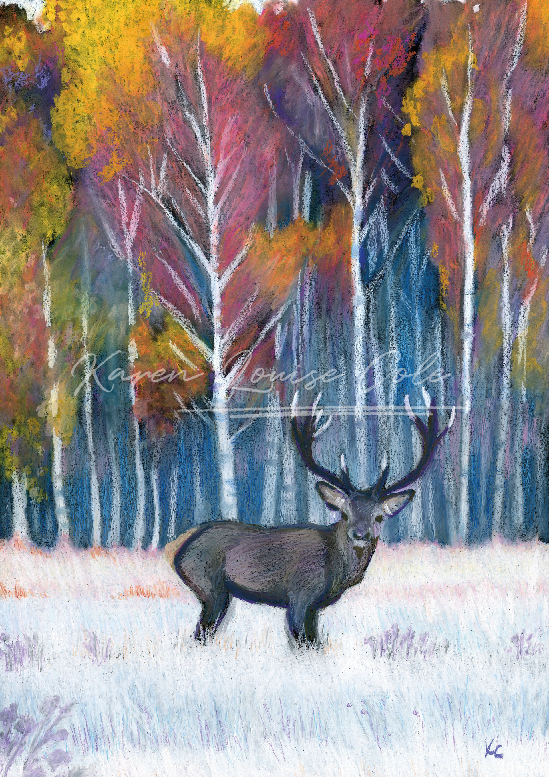 This surface pattern collection draws inspiration from an original oil pastel artwork by Karen, depicting a solitary stag set against an autumnal silver birch woodland. The pattern designs capture an essence of the vibrant forest, alive with the shifting hues of autumn that represent the seasonal transformations in nature.